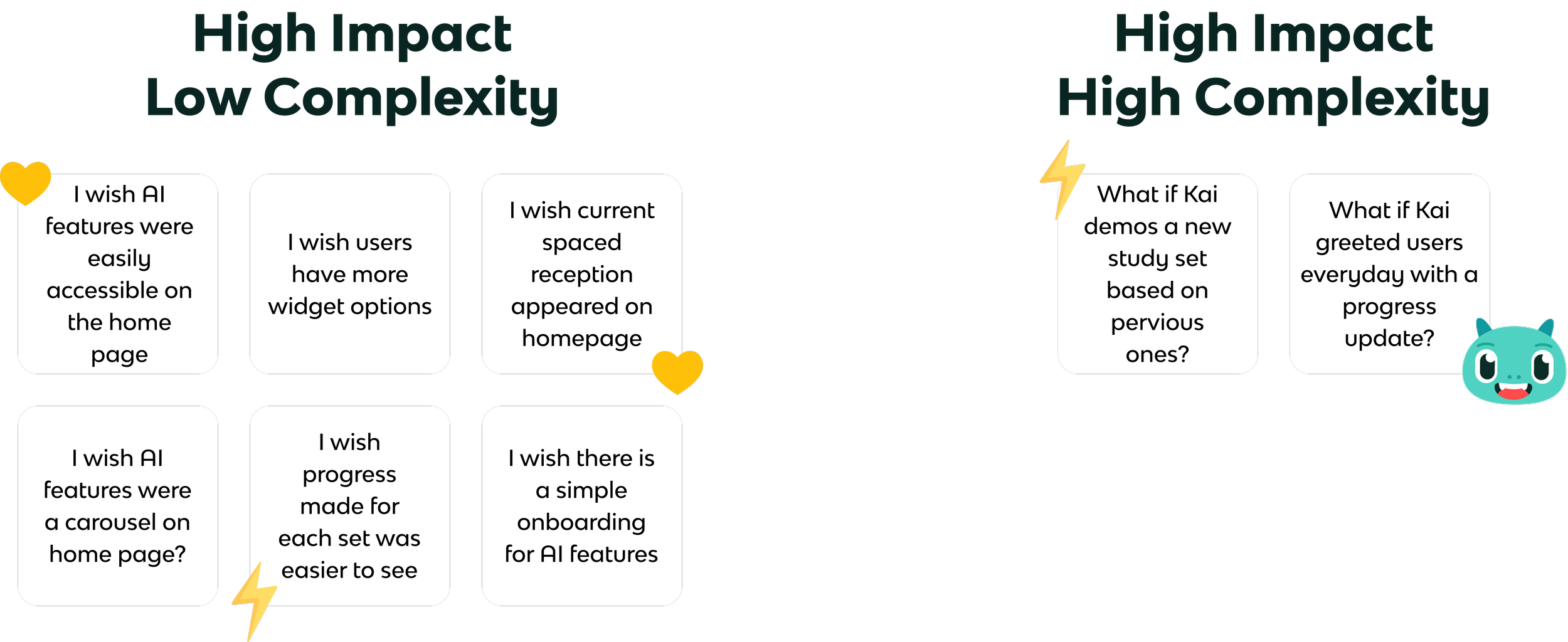 For Knowt’s Home Page Redesign, I used the “I Like, I Wish, What If…?” exercise to identify features that address the challenges users face. I prioritized features based on impact and complexity, focusing first on high impact, low complexity solutions to deliver immediate value, followed by high impact, high complexity features for lasting improvements.