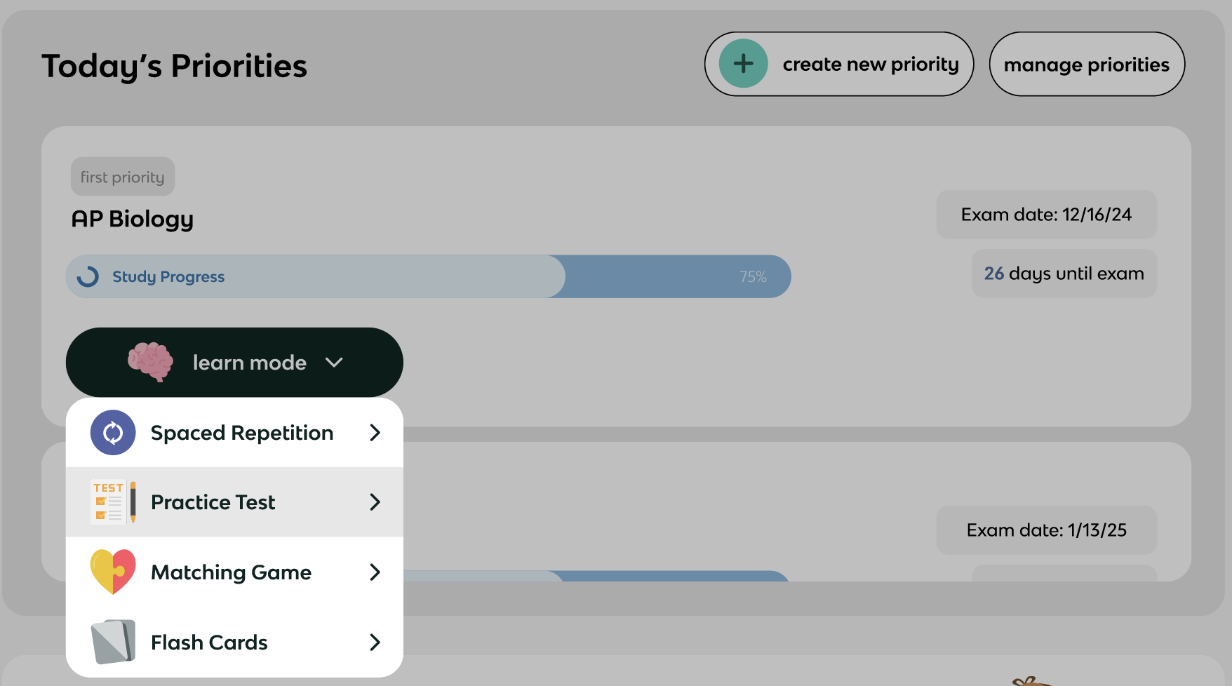The second section, “Today’s Priorities,” displays all study decks in progress with a progress bar to motivate continued learning. Users can use the dropdown to switch study modes, and decks are organized by exam date priority.