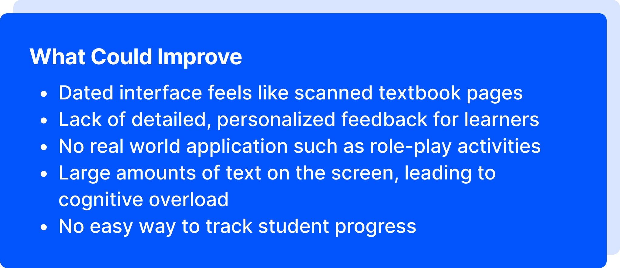 I evaluated Burlington English because it’s the tool currently used by the ESOL teacher I observed. Studying it helped me identify what works well and where there’s room for a more effective, user-centered solution.